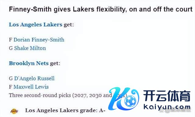 12月30日,洛杉矶湖东说念主与布鲁克林篮网负责完成了一笔激勉全定约关爱的来去。湖东说念主送出德安吉洛·拉塞尔、刘易斯以及三个次轮签(2027年、2030年、2031年)换来了篮网的芬尼-史姑娘和谢克·米尔顿。这一来去不仅为湖东说念主的锋线驻守和板凳深度带来了彰着升级,还通过薪资休养为球队的畴昔操作提供了更大的纯真性。