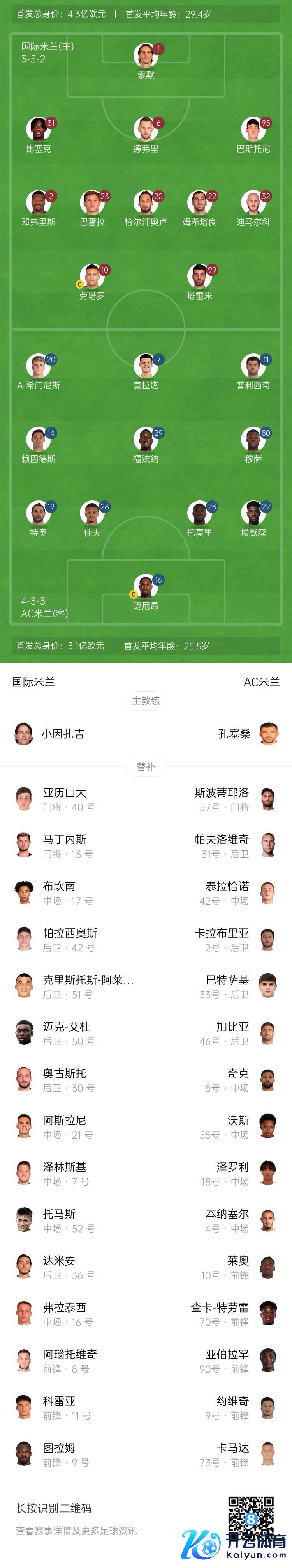 国米替补:13-何塞普-马丁内斯、40-卡利加里斯、7-泽林斯基、8-阿瑙托维奇、9-小图拉姆、11-科雷亚、16-弗拉西洋、17-布坎南、21-阿斯拉尼、30-奥古斯托、36-达米安、42-帕拉西奥斯、50-艾杜、51-阿莱西奥、52-贝伦布鲁赫